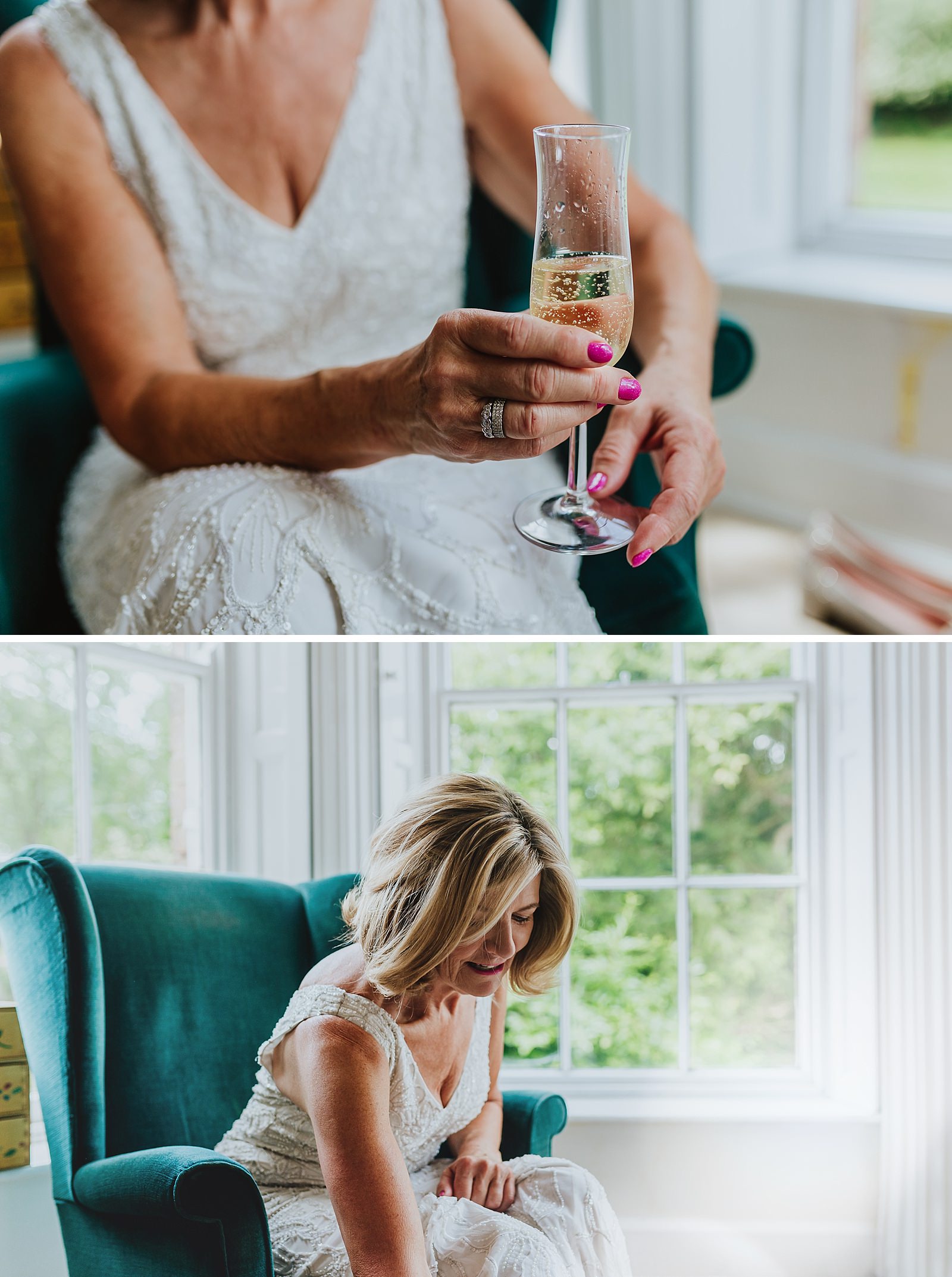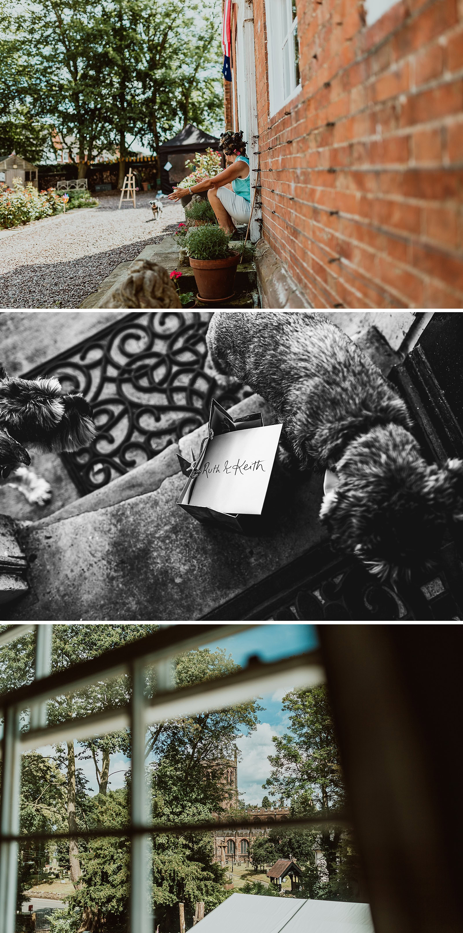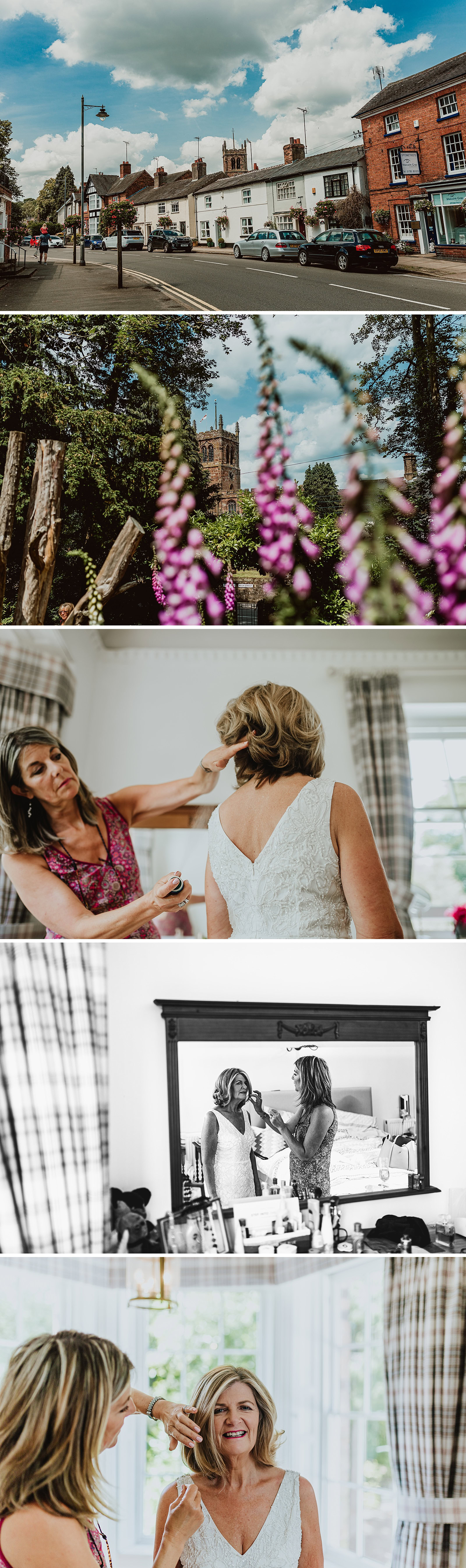 After poor weather in the weeks leading up to the big day, it arrived with clear blue skies with warm sun shining right over Eccleshall. I arrived bright and early for some shots of of the church and garden with family already relaxing in the sun outside. Ruth and her bridal team were already getting prepped, sipping bubbly and singing along to music. It was a delight to be able to see the church they would be married in later that day from the bedroom window, tall foxgloves covering the garden, what a perfect setting.